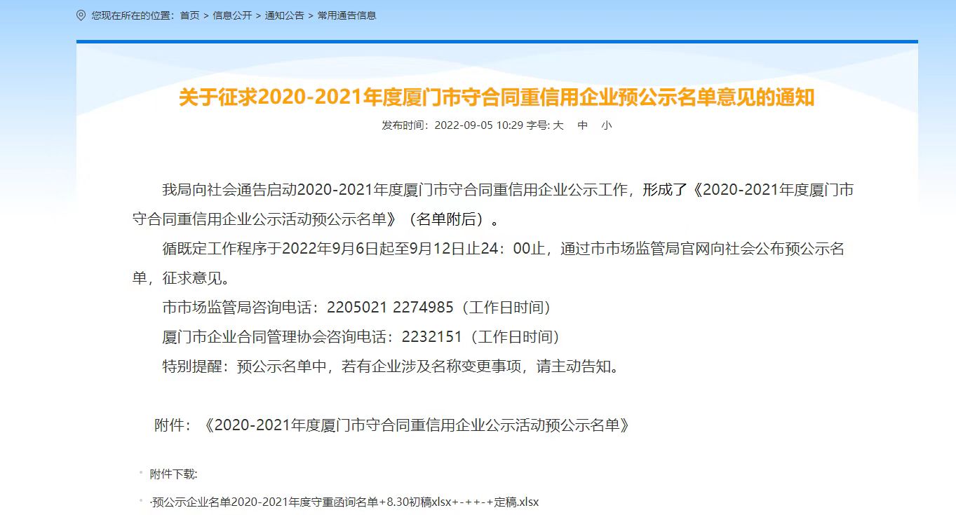 • 2022年9月5日,,厦门市市场监督管理局(知识产权局)公示了2020-2021年度厦门市守合同重信用企业,,经过网上申报、、书面审查和征信等多个评选程序,,福建z6com·尊龙凯时科技有限公司凭借在合同管理、、、合同履约、、经营效益上的良好表现从众多企业中脱颖而出,,,,荣获2020-2021年度厦门市守合同重信用企业殊荣。。